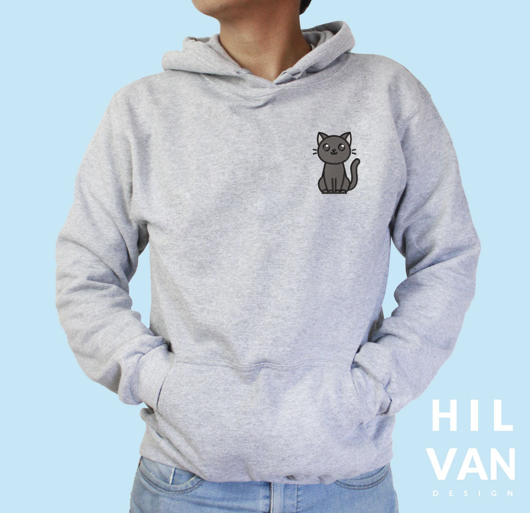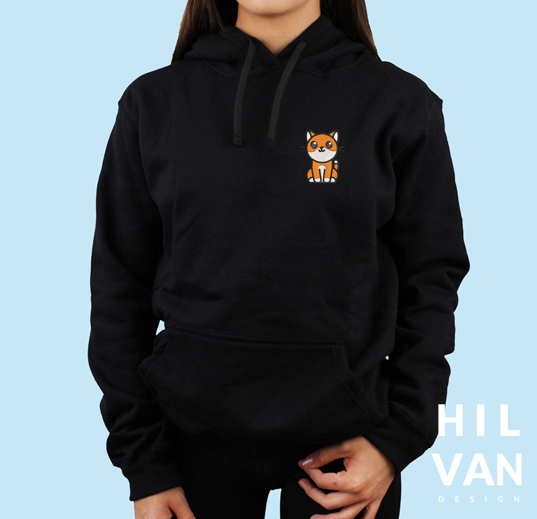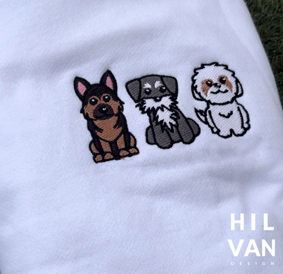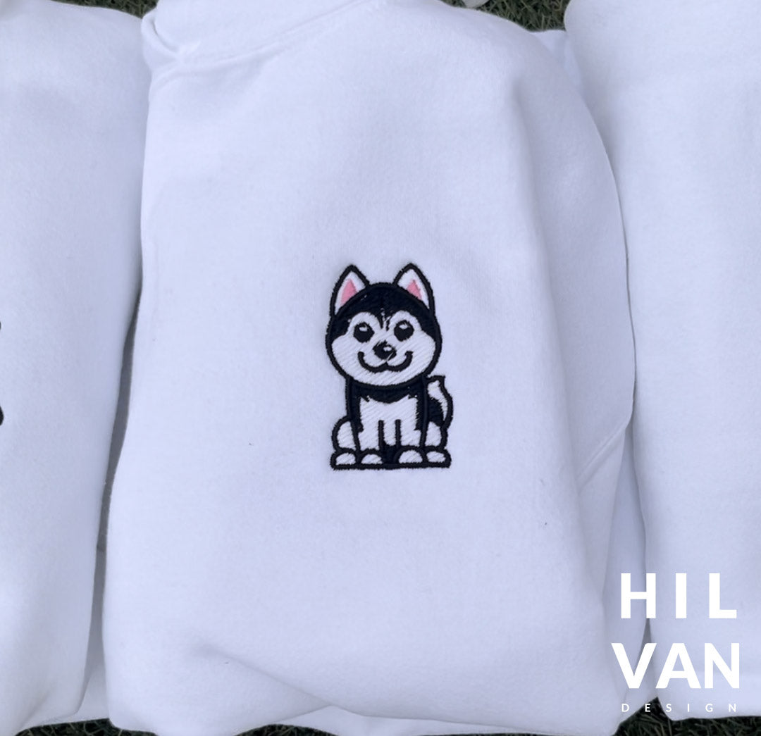 Sudaderas bordadas con bordado de tu mascota animado tamaño bolsillo en el lado izquierdo y en la manga derecha el nombre con huellita.