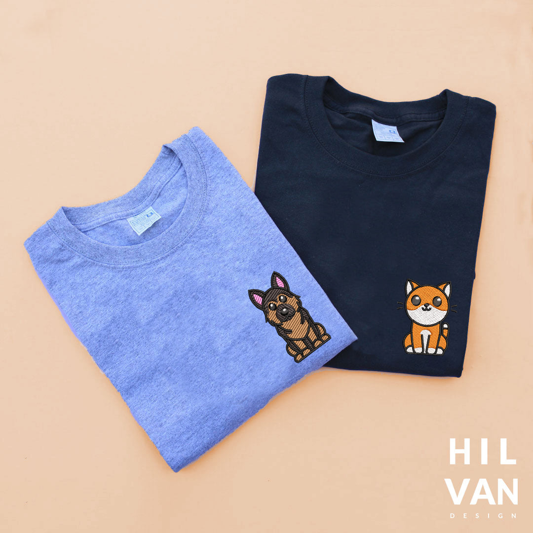 Playera bordada con bordado de tu mascota animado tamaño bolsillo en el lado izquierdo.
